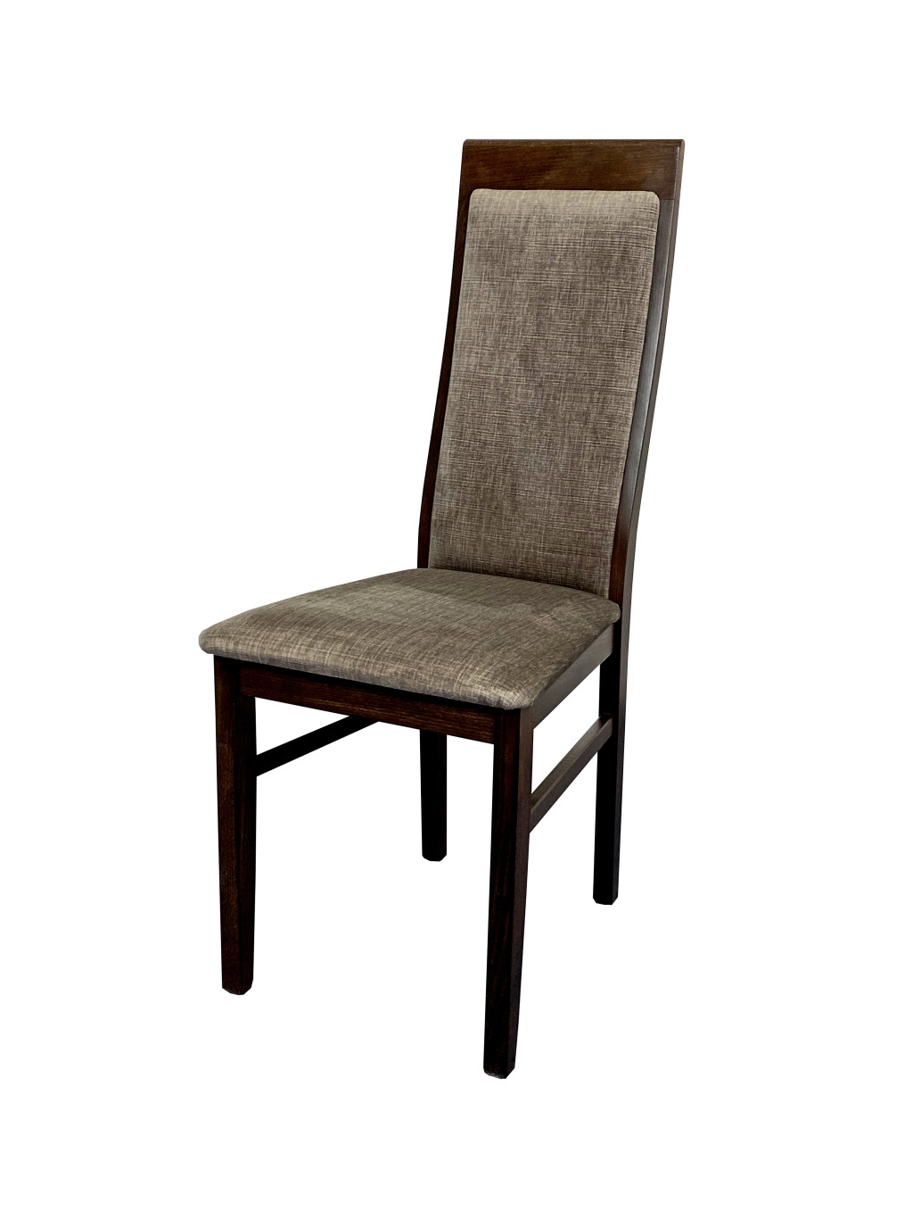 Az étkezőszék vázának illetve lábainak színe wenge, a kárpit színe szürkés barna szövet.