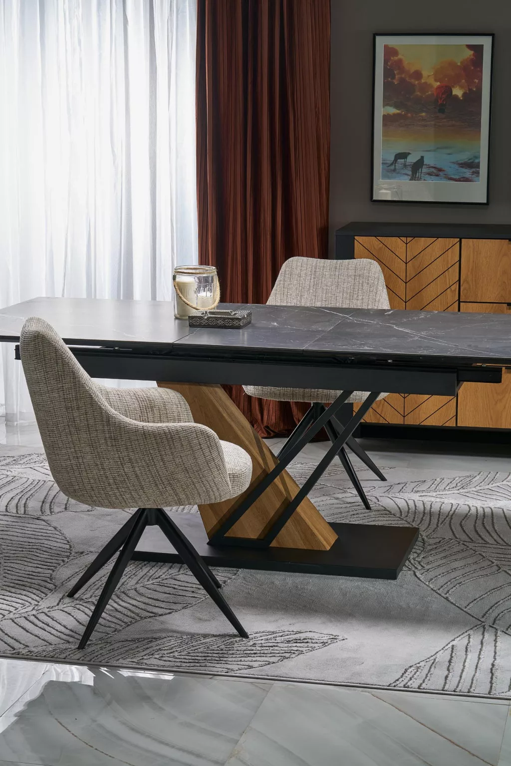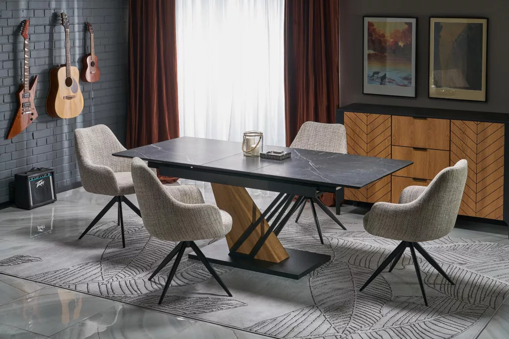 Az asztallap tartós, szinterezett kőből készült, fekete márvány színben, ami eleganciát és luxus jelleget kölcsönöz az asztalnak.