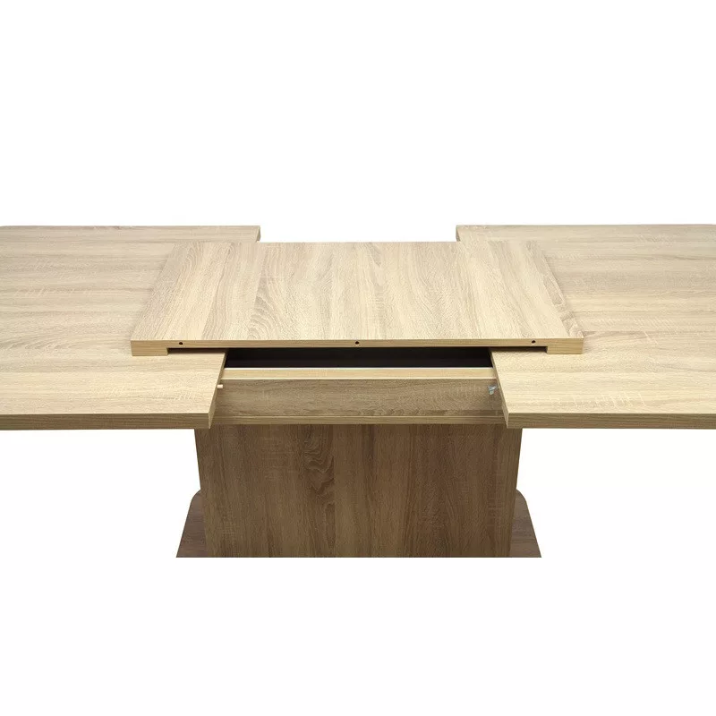 Ennek az asztalnak a lábazata és az asztallapja laminált faforgácslapból készült ABS élzárással, duplungolt kivitellel és PU ragasztási technológiával (Víz-, pára és hőálló, tartós kötést biztosít, ennek köszönhetően a bútorok élettartalmát jóval megnöveli!). Nagyobbítás, fém vasalattal történik. A plusz betét az asztal alatt tárolható.
