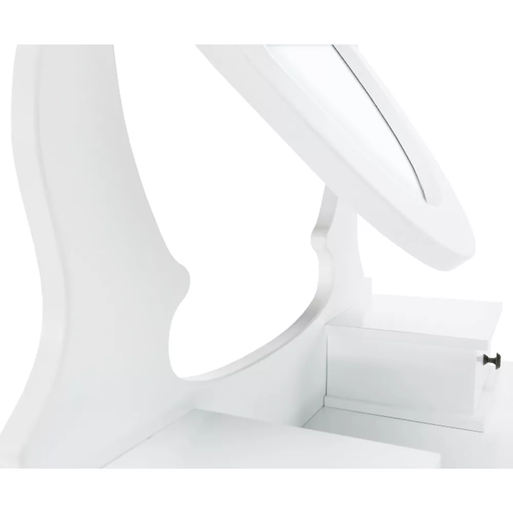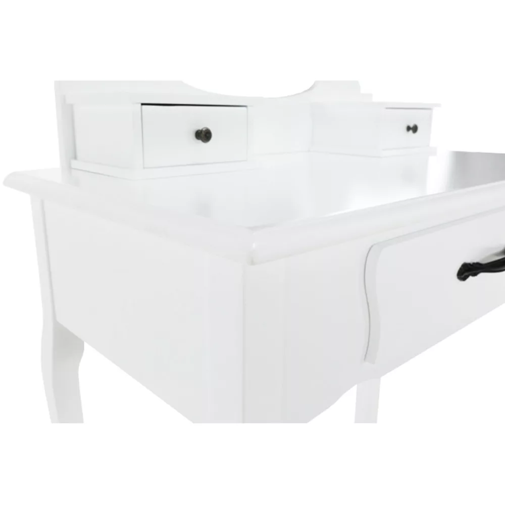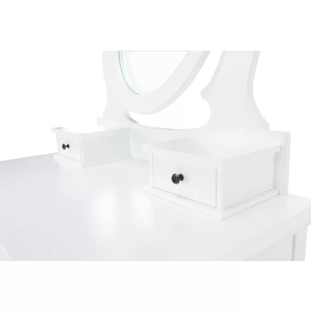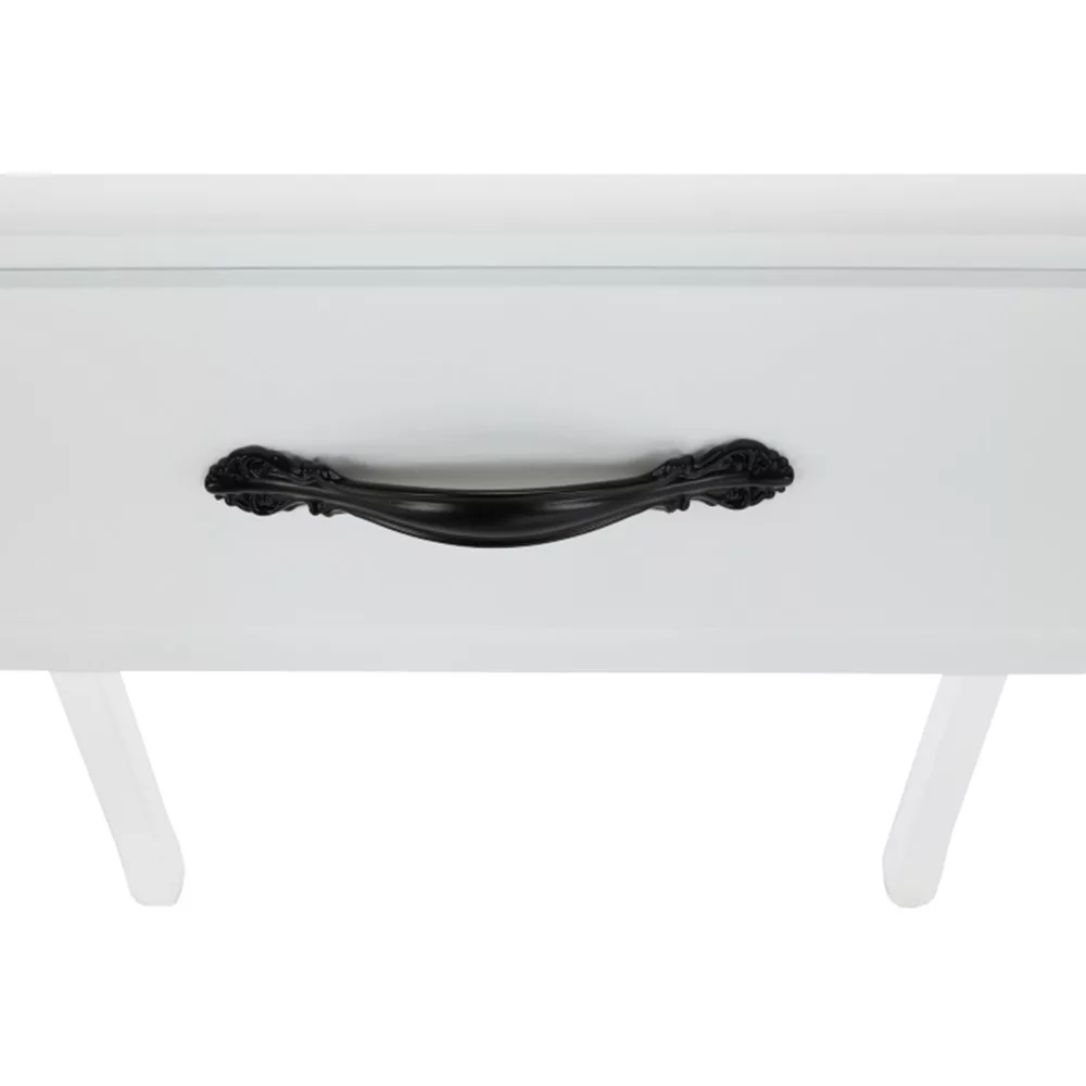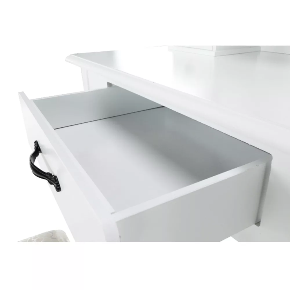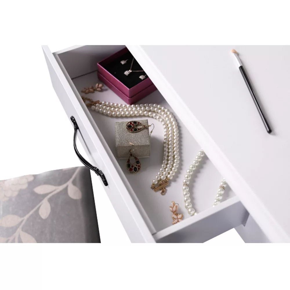 A fehér MDF tiszta kialakítása, a tömör fa lábak és a fém fogantyúk segítségével tökéletes darab lesz a hálószobájához. Ami a fésülködőasztalt különlegessé és kifejezetten hasznossá teszi, az kétségtelenül a tükör, amelynek köszönhetően tökéletesen nézhet ki.
