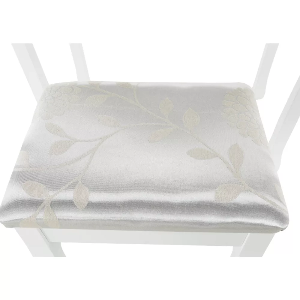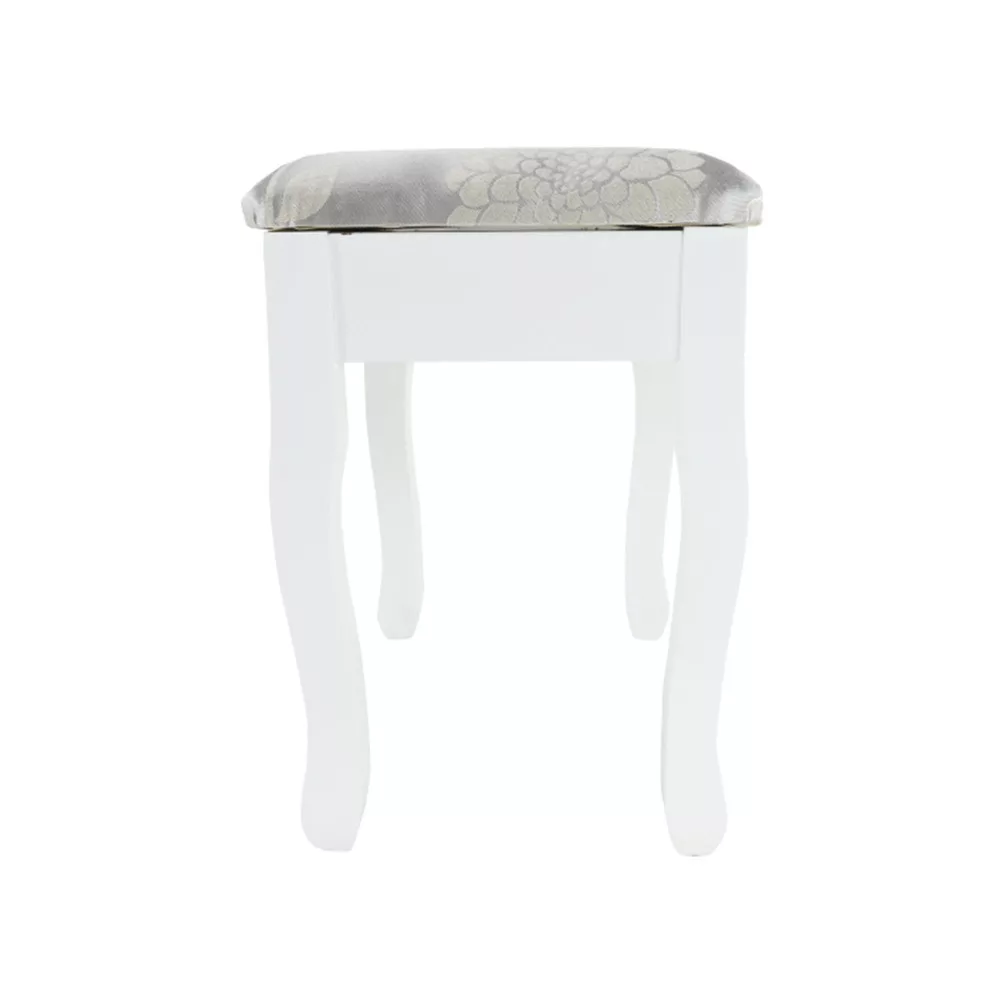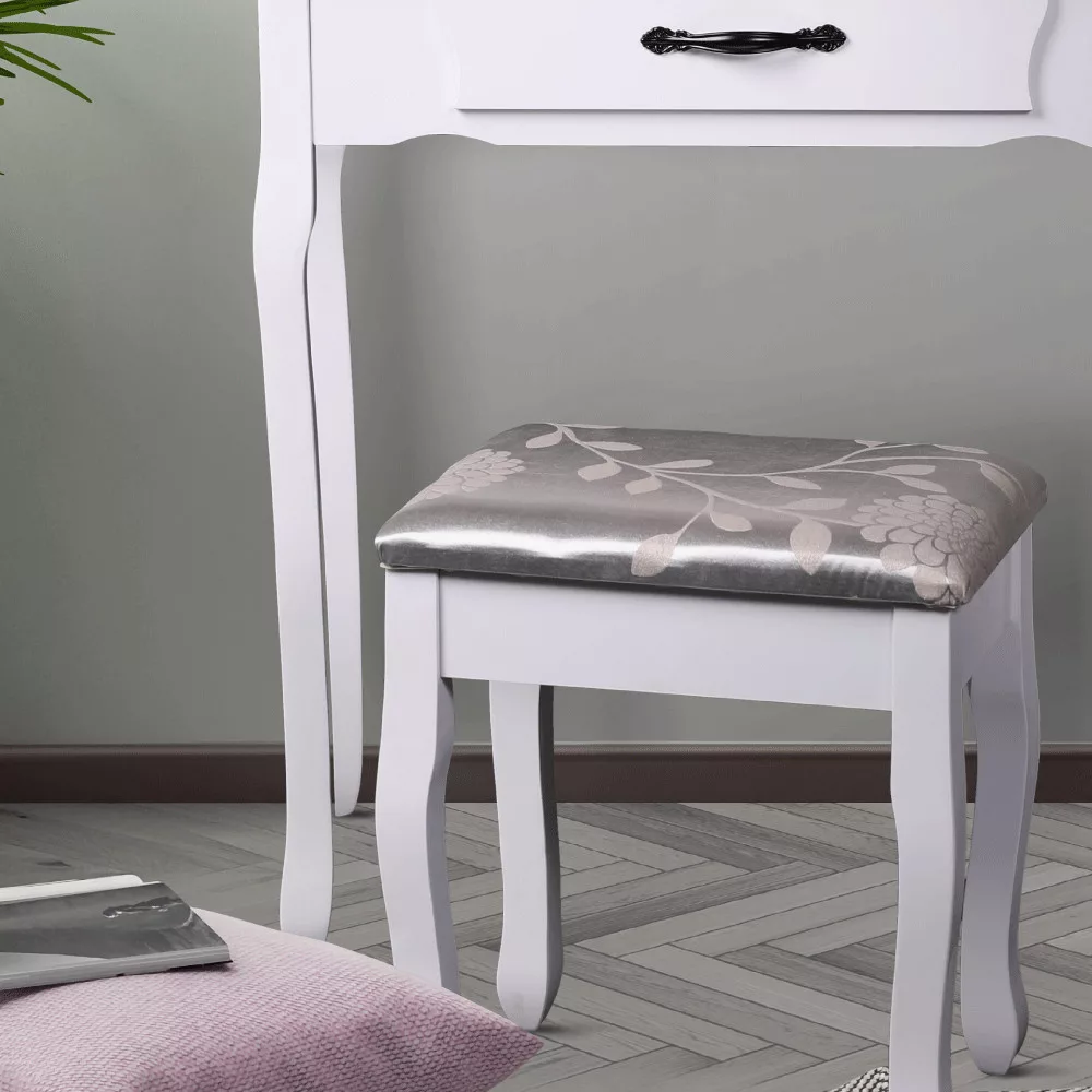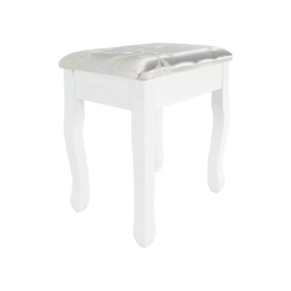 A szépségsarok azonban nem lehetne a jólét és a kikapcsolódás helye, ha állni kellene mellette. Ezért az asztalhoz zsámoly is érkezik. Kis, négylábú csoda, ezüst-arany színű szövetbe öltözve.