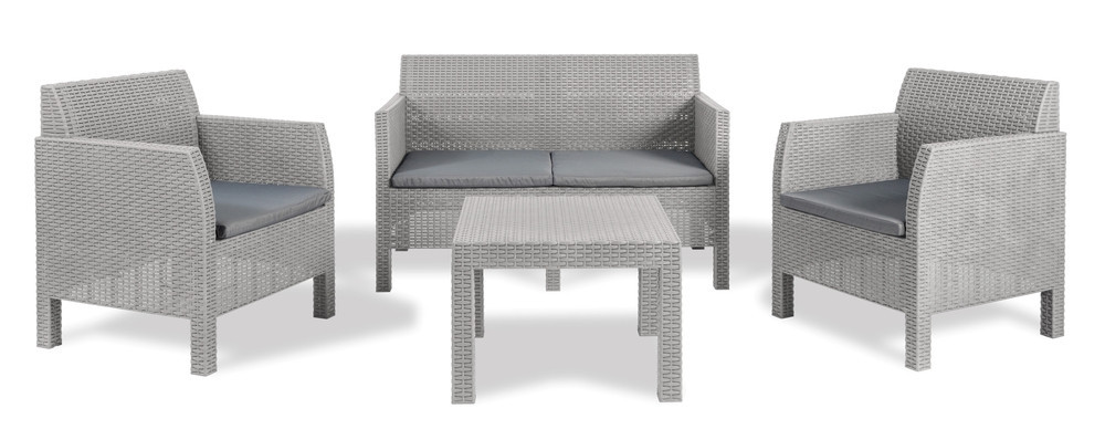 A szett két kényelmes fotelt, egy kétszemélyes kanapét és egy asztalt tartalmaz, a garnitúrát úgy tervezték, hogy kényelmes ülő- és kikapcsolódást kínáljon négy személy számára, legyen szó reggeli kávéról a teraszon vagy délutáni teáról a kertben.