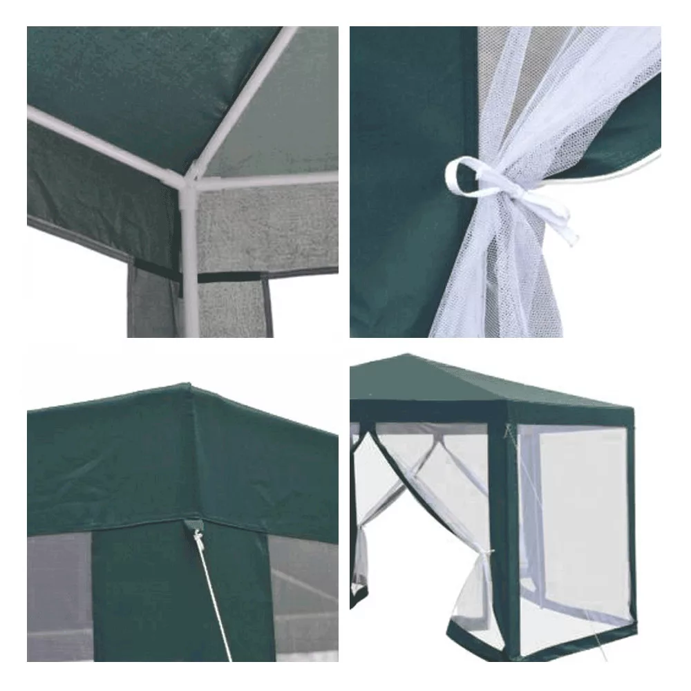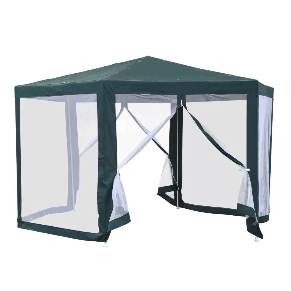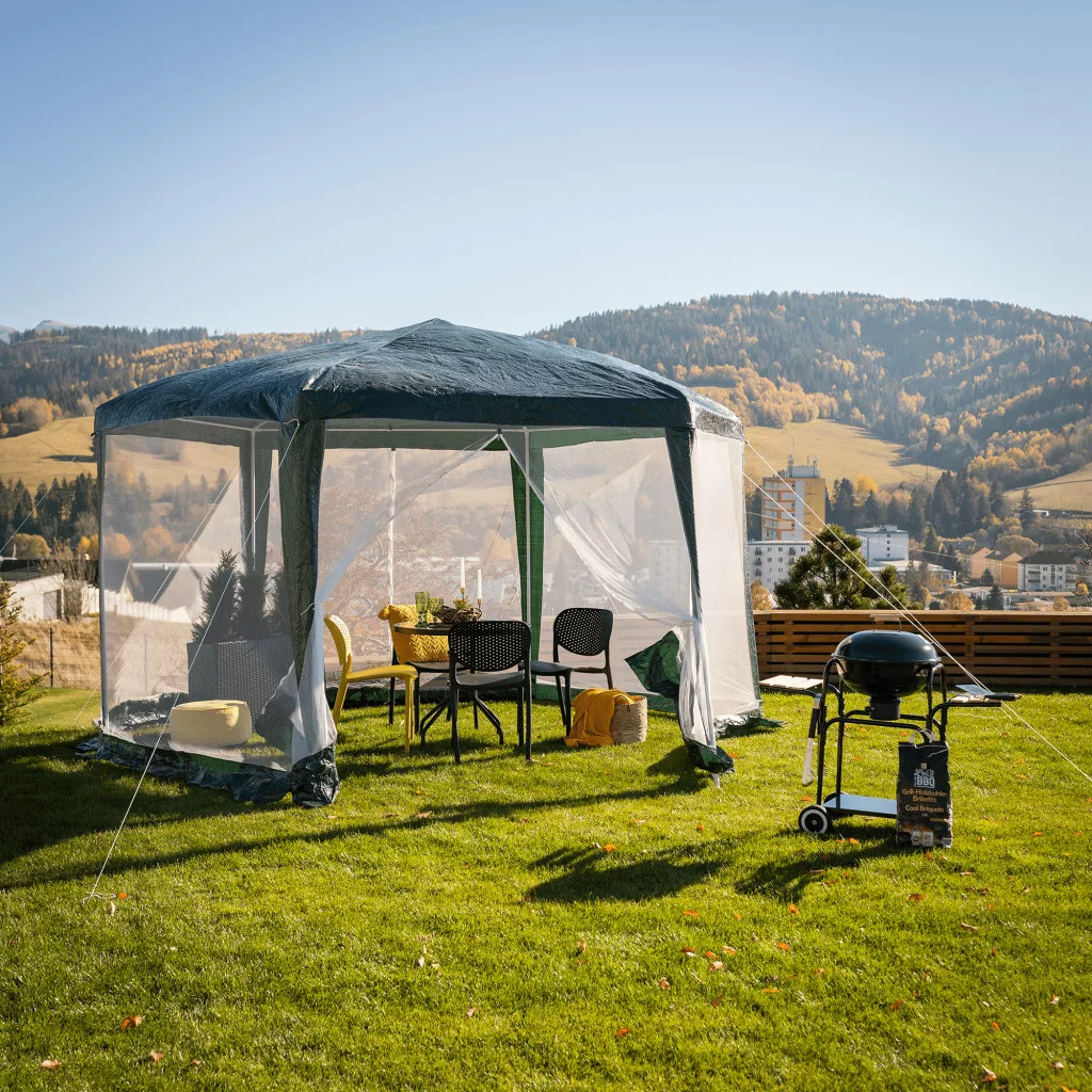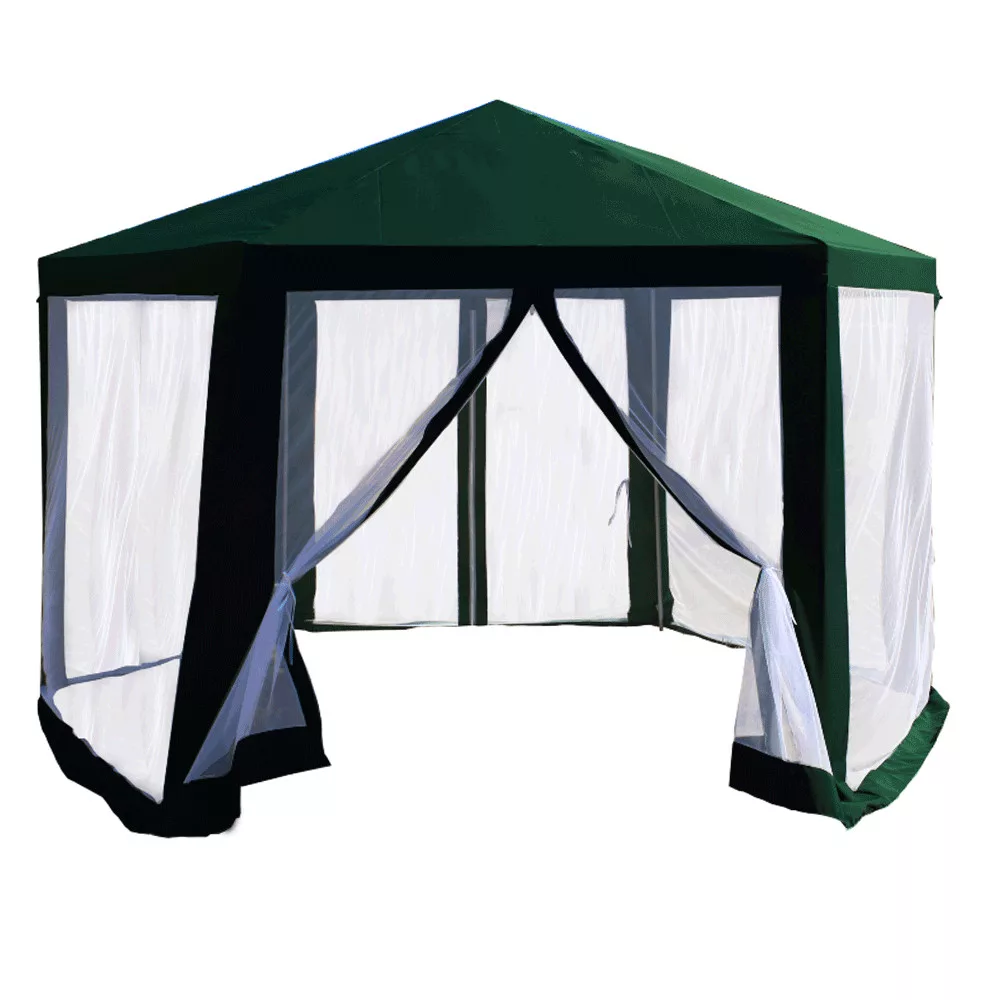 Gyorsan összecsukható kerti pavilonunk hatszög alakú, 6 oldalas, ún. szúnyoghálós, amelynek 2 oldalfala cipzárral van ellátva. A sátor szerkezete acélból készült, az anyagot zöld és fehér színű polietilén alkotja. A csőszerkezet garantálja a gyors és egyszerű összeszerelést. A pavilon sátor megbízható védelmet nyújt a nap, a gyenge eső, de a betolakodó rovarok ellen is. A pavilont viszont védeni kell az erős szél és hó ellen. Ez a praktikus segítőtárs könnyen karbantartható és praktikusan hordozható.