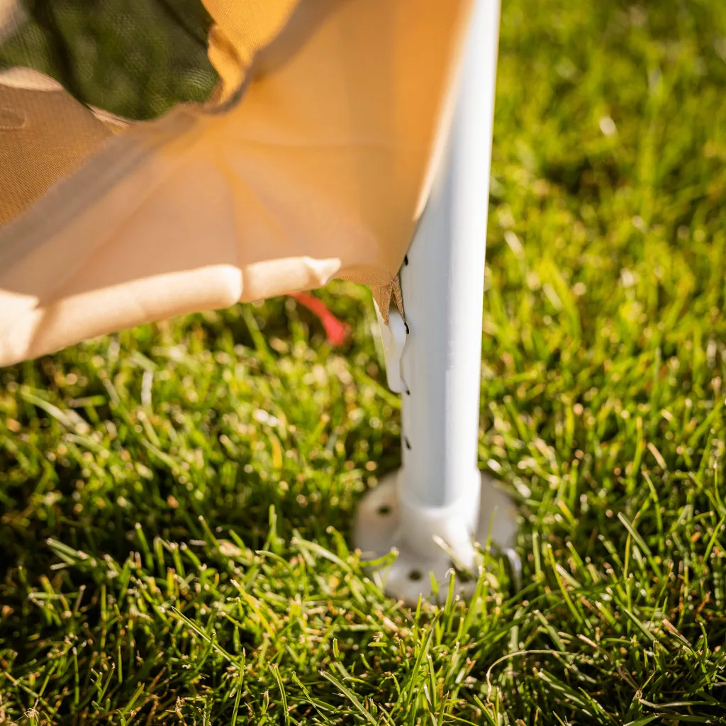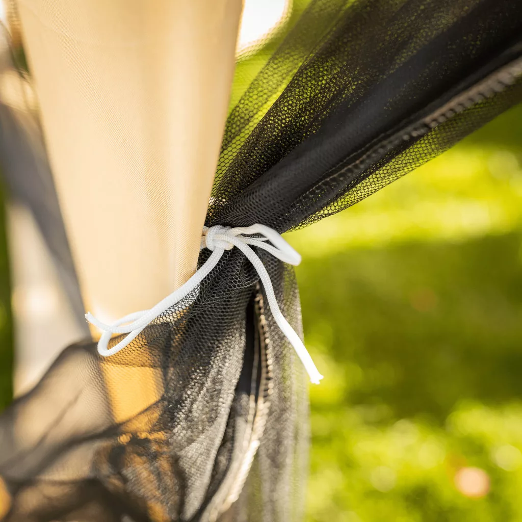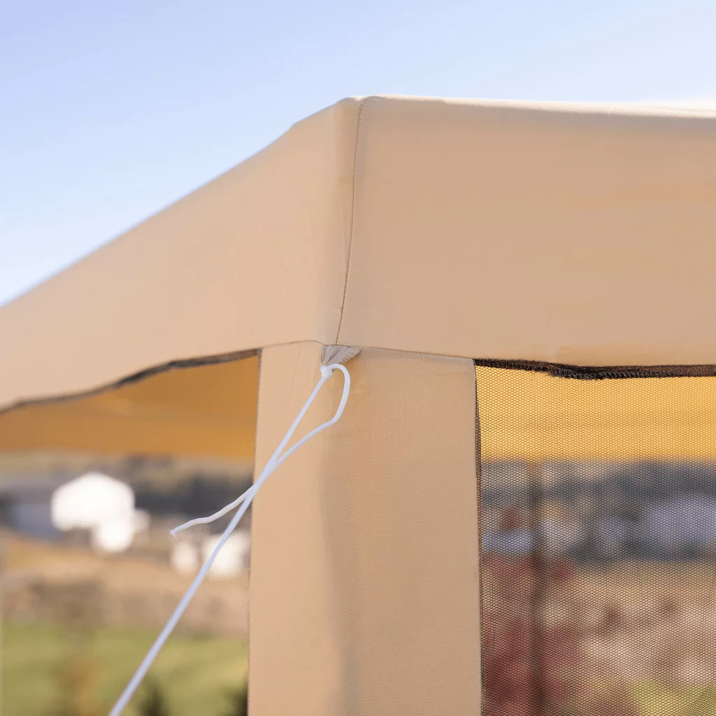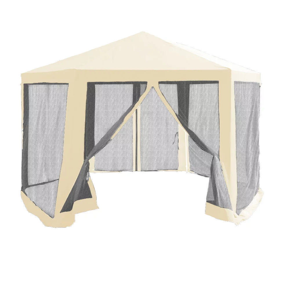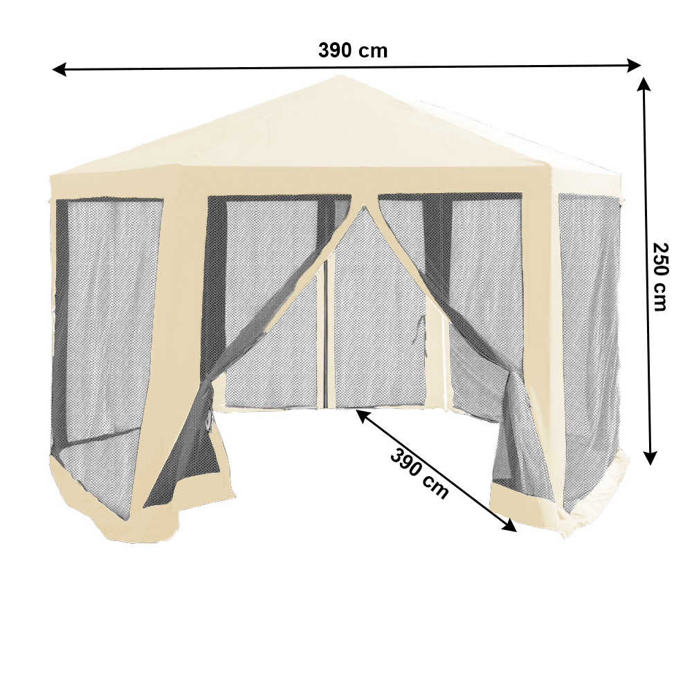 Gyorsan összecsukható kerti pavilonunk hatszög alakú, 6 oldalas, ún. szúnyoghálós, amelynek 2 oldalfala cipzárral van ellátva. A sátor szerkezete acélból készül, az anyagot bézs és fekete polietilén alkotja. A csőszerkezet garantálja a gyors és egyszerű összeszerelést. A sátor megbízható védelmet nyújt a nap, a gyenge eső, de a betolakodó rovarok ellen is. A pavilont viszont védeni kell az erős szél és hó ellen. Ez a praktikus segítőtárs könnyen karbantartható és praktikusan hordozható.
