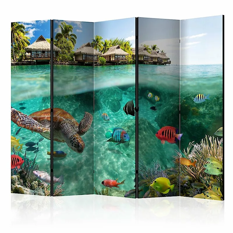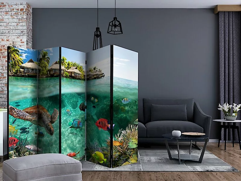 Az "A víz felszíne alatt II" díszítő paraván egy kivételes része a modern beltereknek. A 5-részes, fából készült és kétoldalúan nyomtatott paraván nemcsak diszkréten elválasztja a teret, de hihetetlen megjelenést is biztosít a beltérnek. A tökéletes kivitelezés és a Full HD minőségű eredeti motívumok azt eredményezik, hogy a szobaparaván mindegyik beltér számára utánozhatatlan csábot biztosít. A beltéri díszparaván minden bizonnyal nagyszerű ötlet a helyiség díszítésére. Érdemes megemlíteni a praktikus alkalmazásukat is - a szobaparavánok használhatók pl. a kiteregetett ruhák eltakarására. Nagyon eredeti díszítőelem, mely mind lakásban, mind irodákban egyaránt használható, pl: fodrászszalonban, orvosi rendelőben vagy akár könyvelői irodában is.