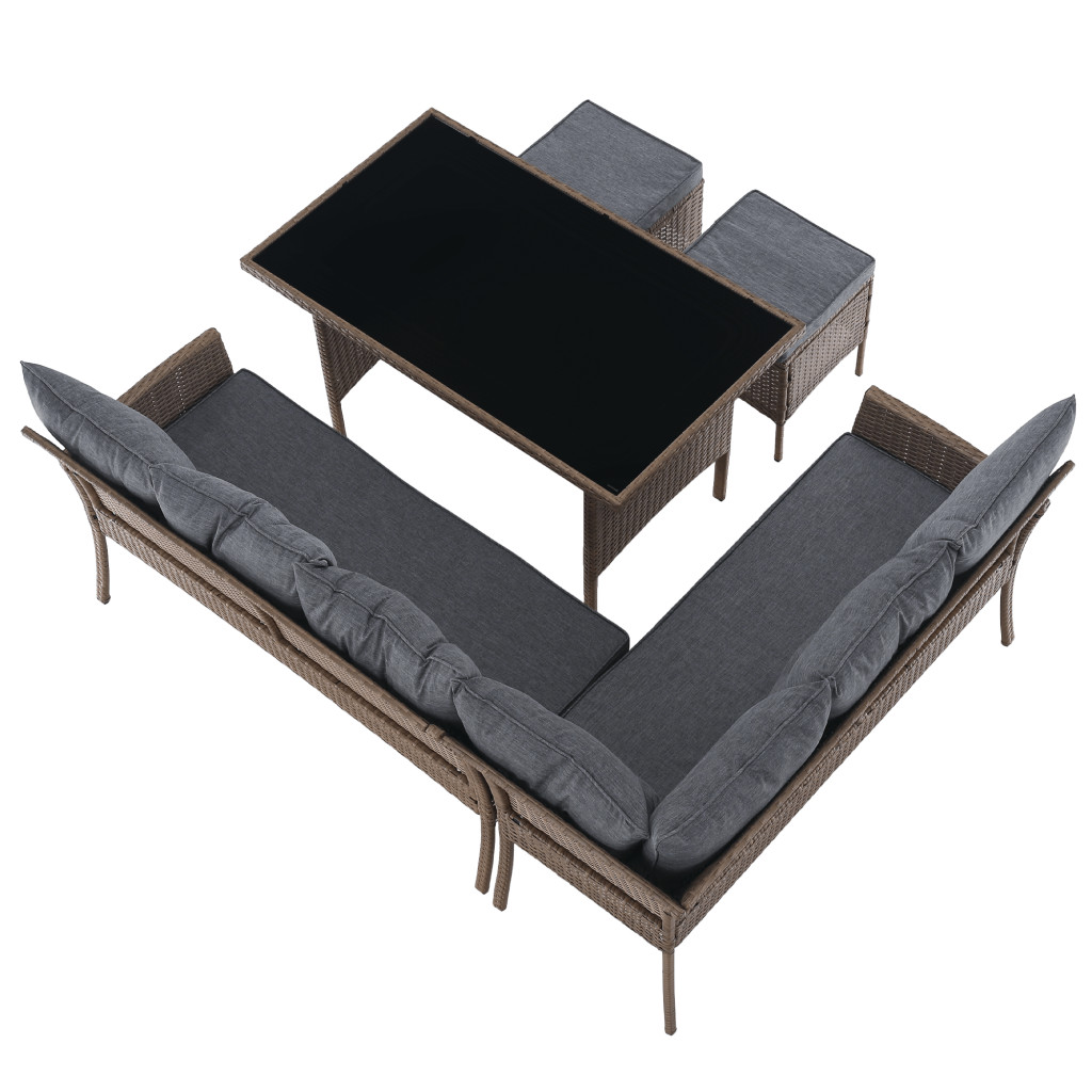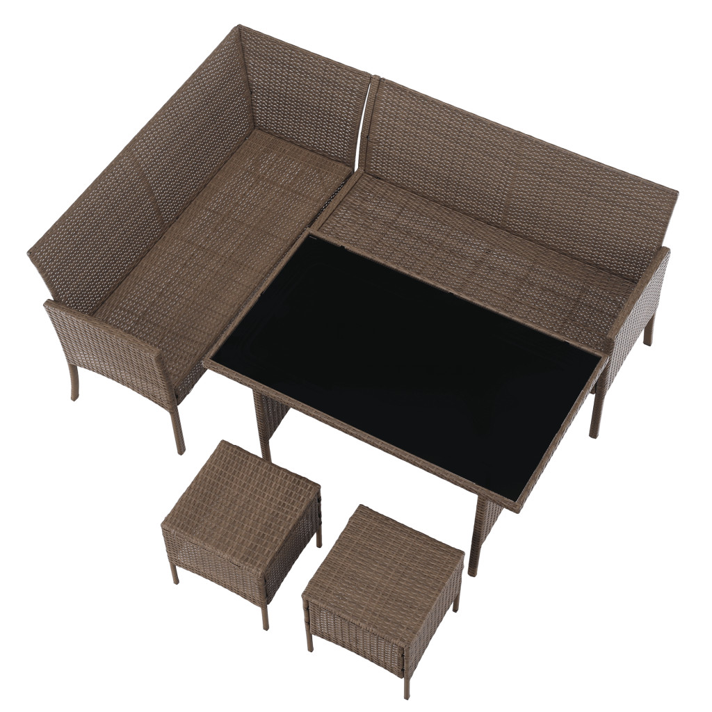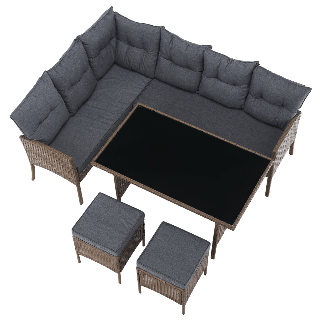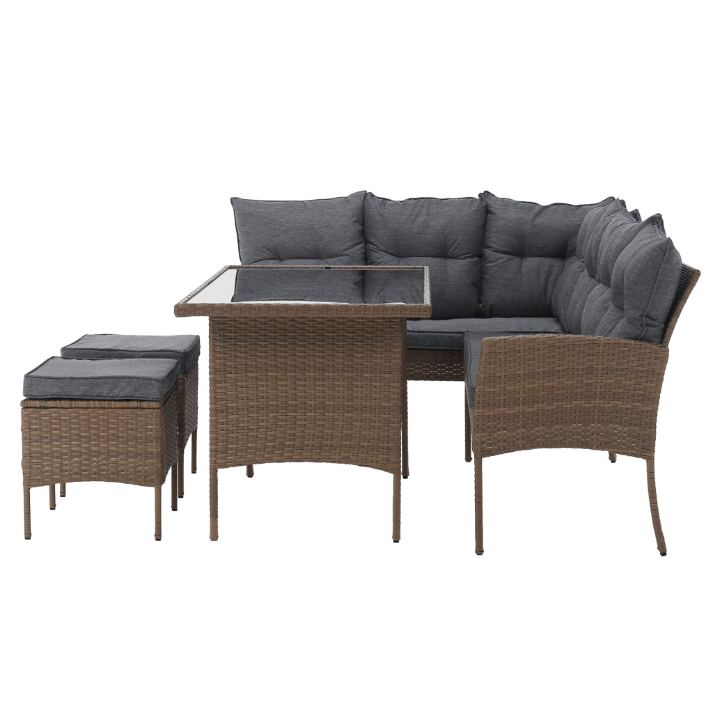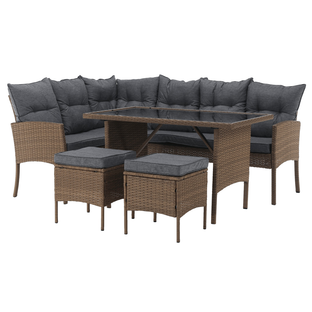 A szettben van egy sarokrész, két fotel és egy étkezőasztal edzett üveggel.