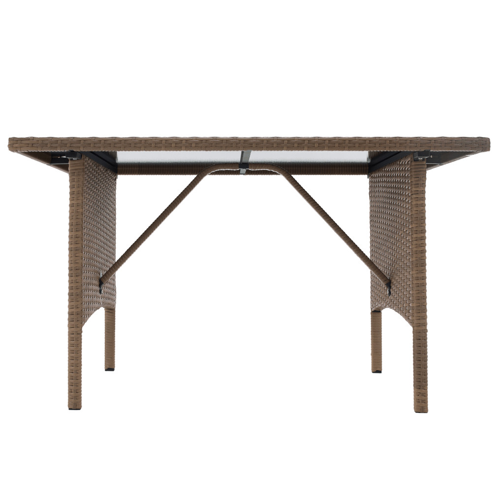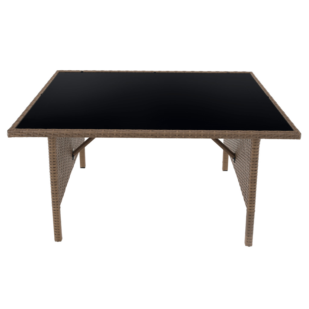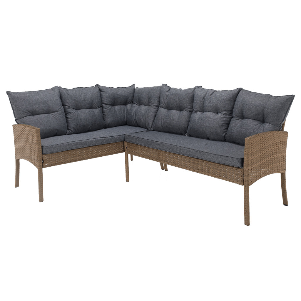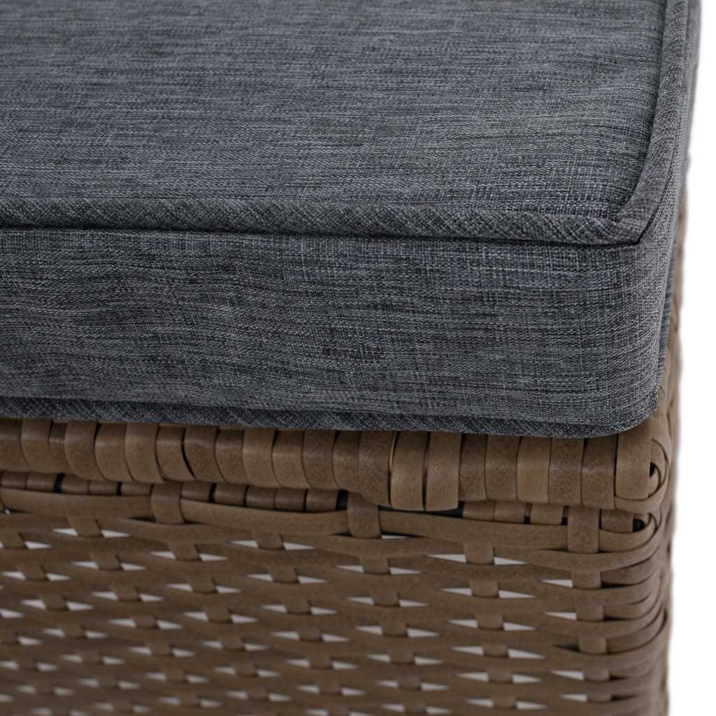 Természetes és világosszürke színű, technorattanból, szövetből, fémből és edzett üvegből készült kerti rattan szett.