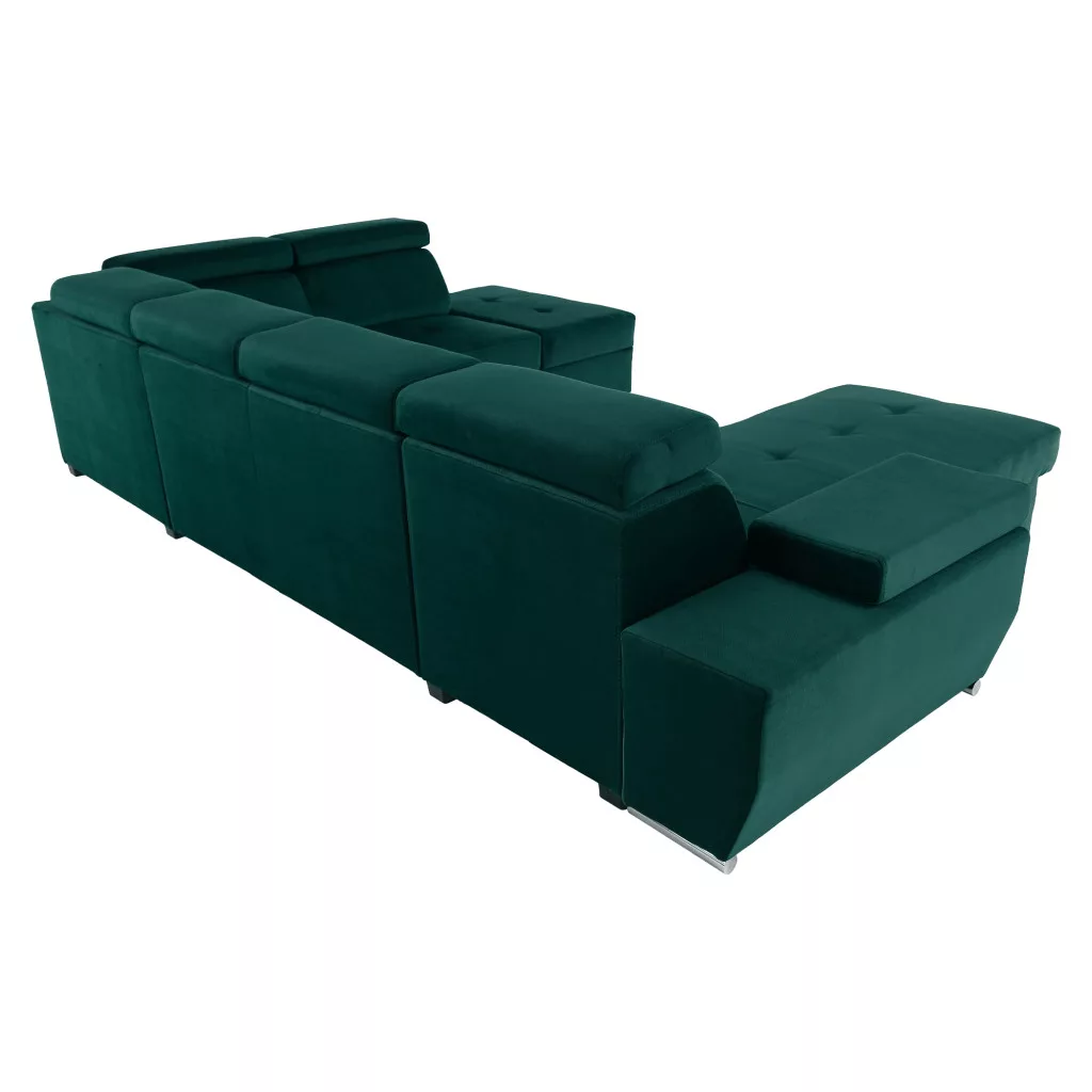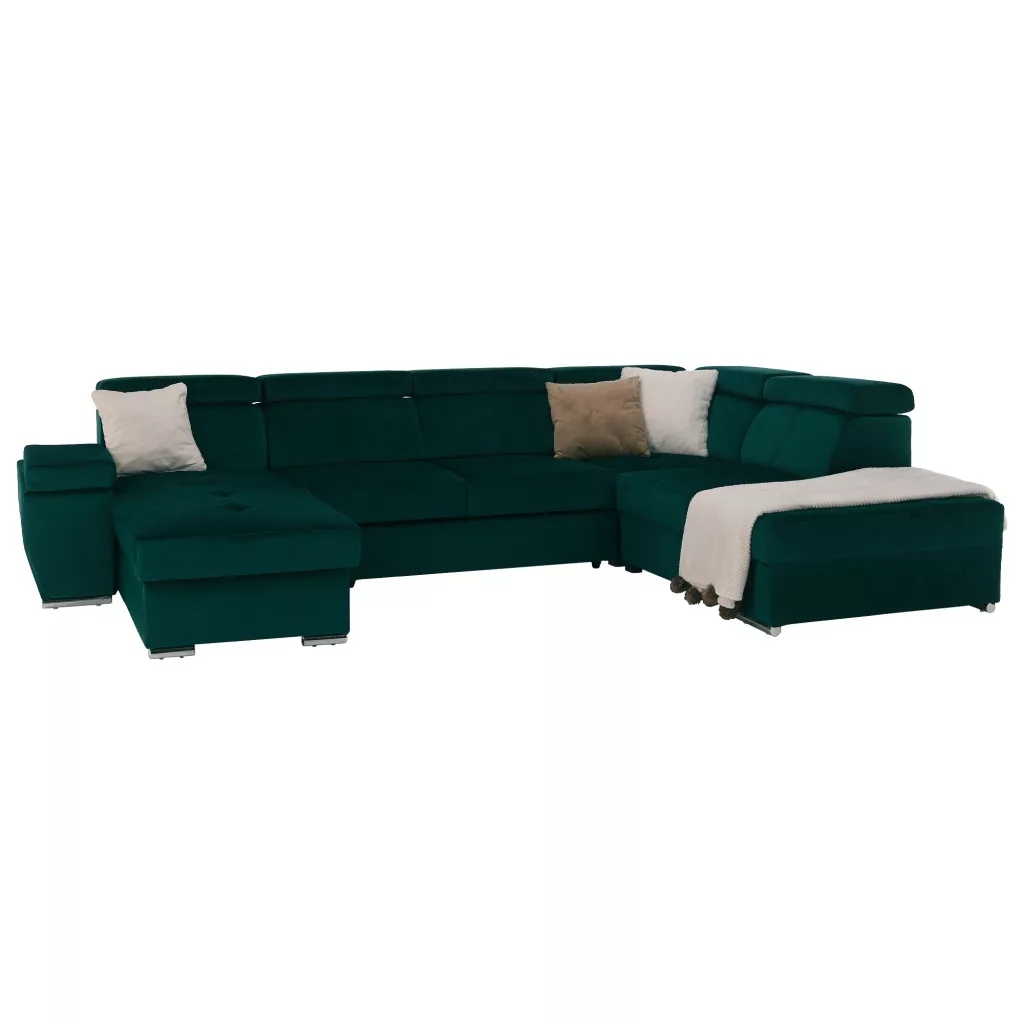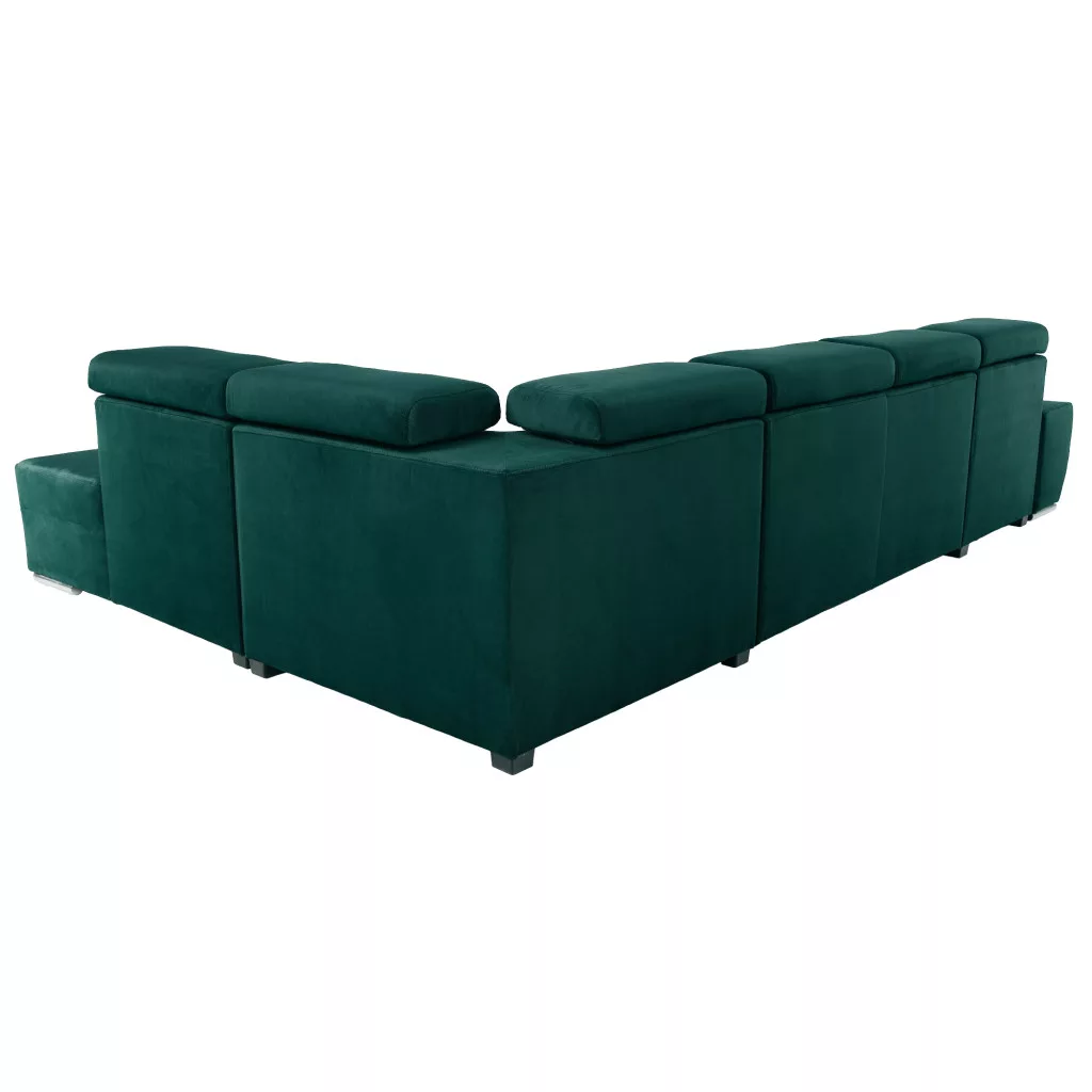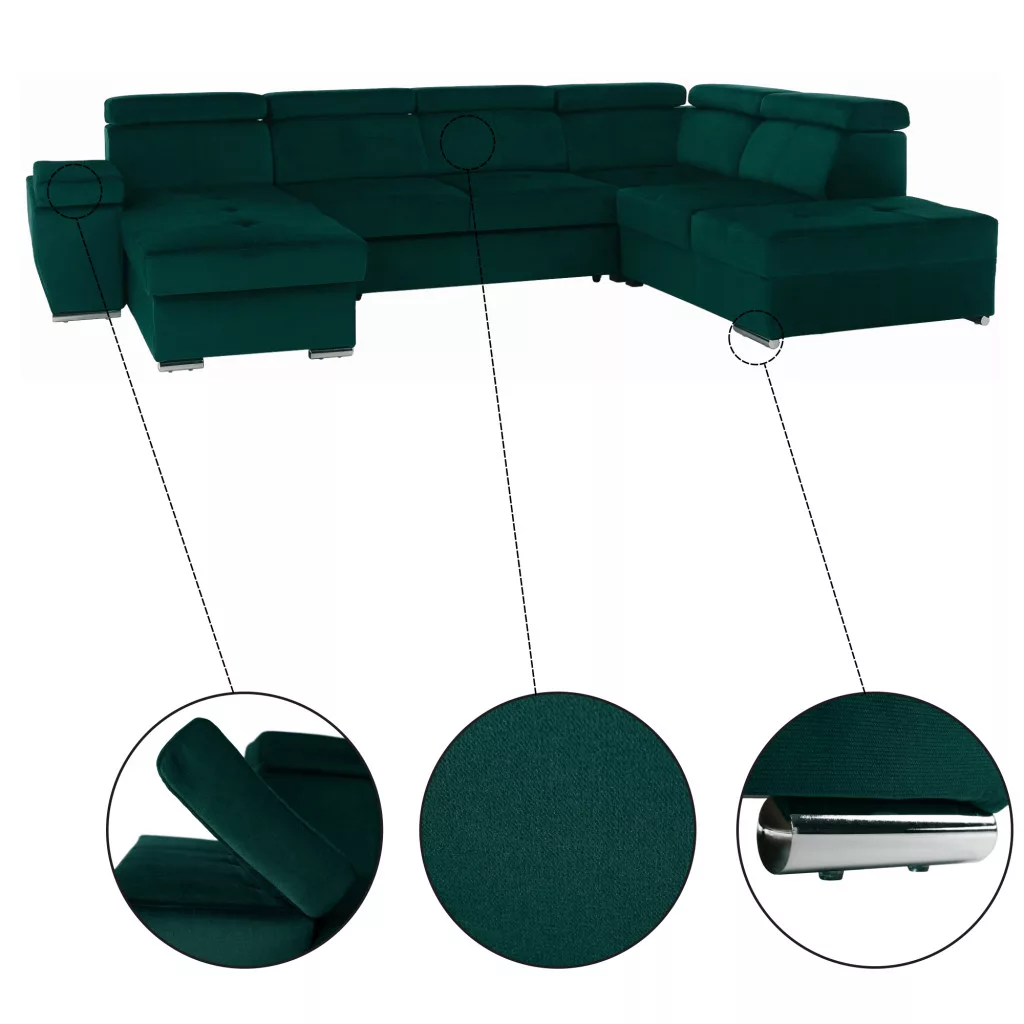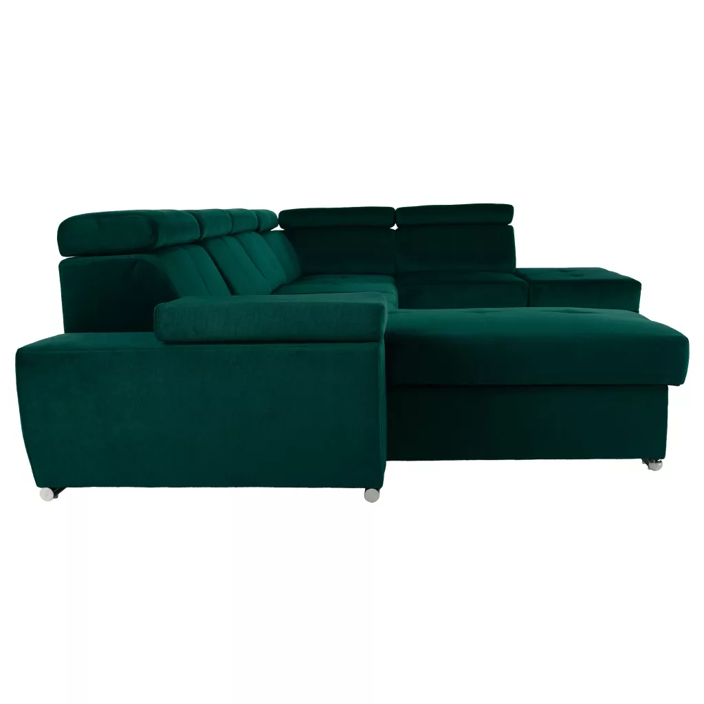 Smaragd színű, szövetből készült U alakú ülőgarnitúra ágyfunkcióval és ágyneműtartóval, jobbos kivitelben.