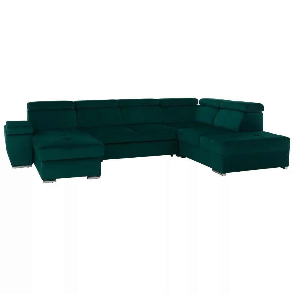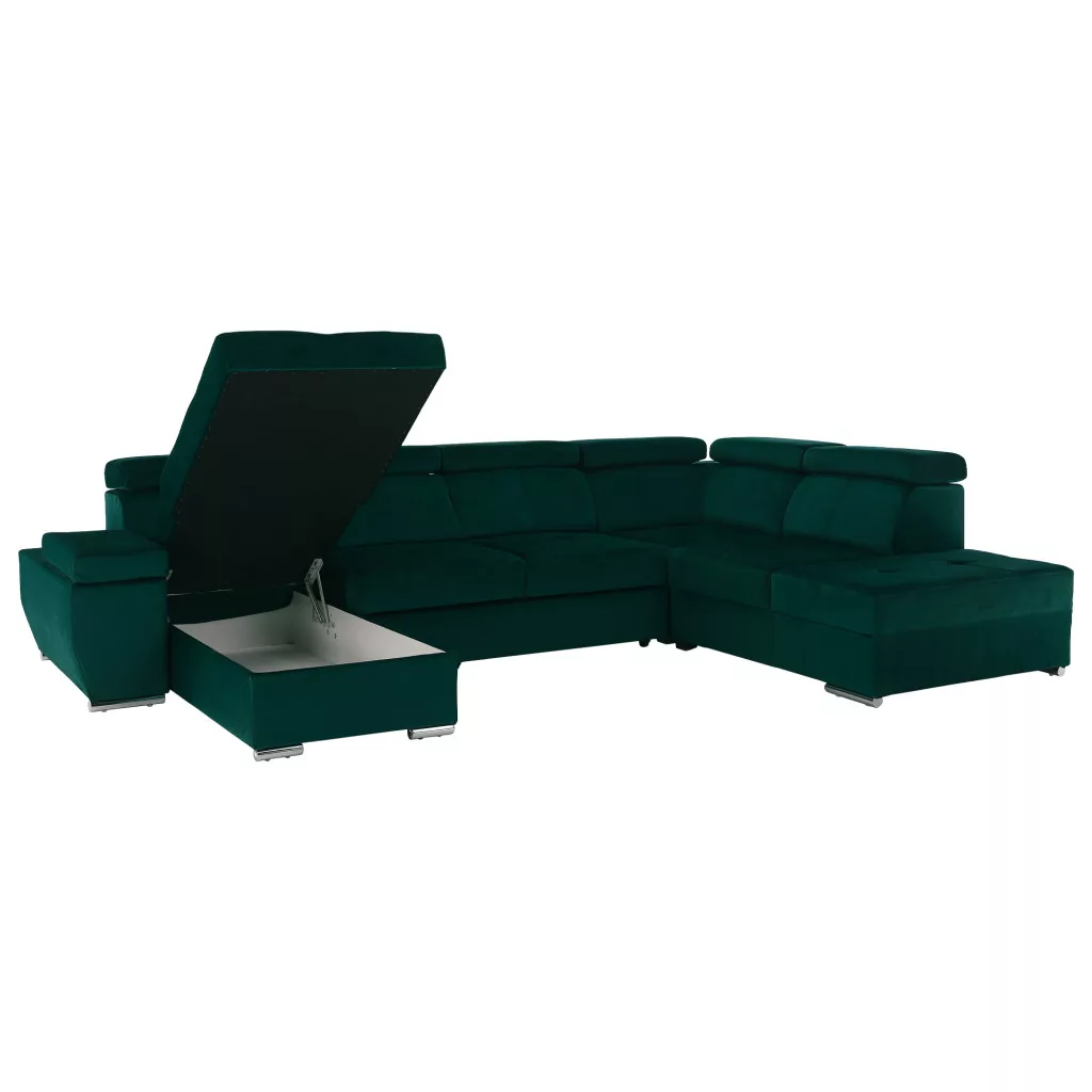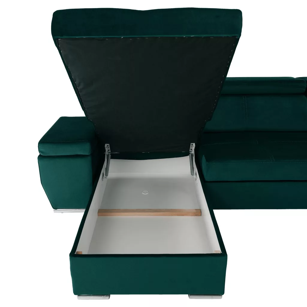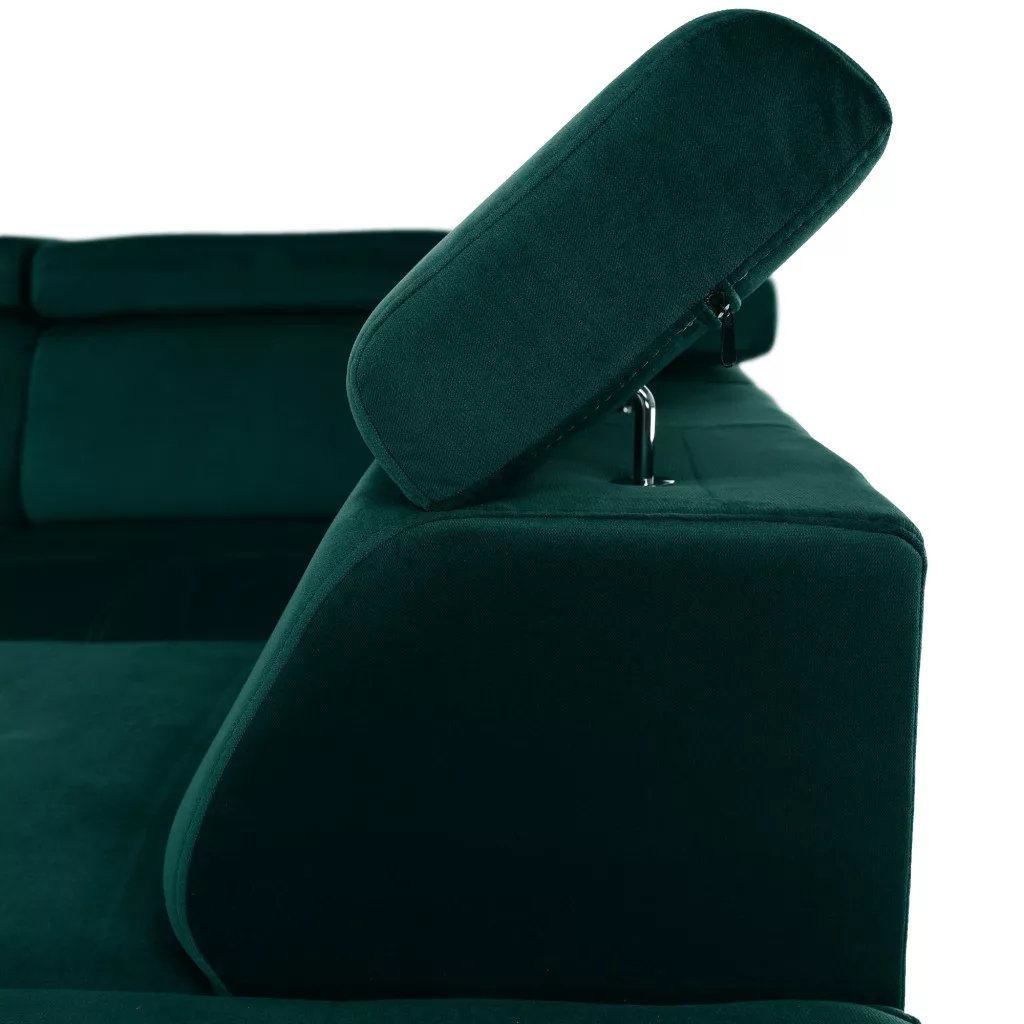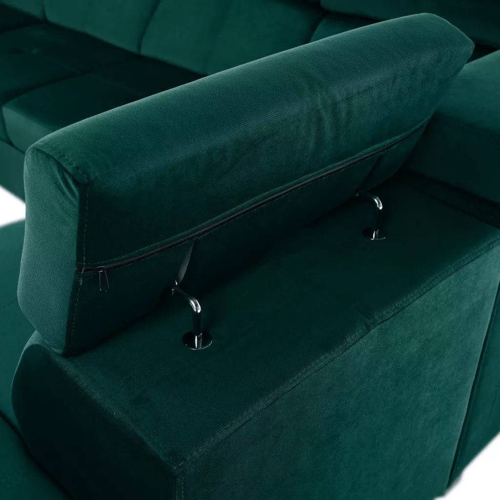 Smaragd színű, szövetből készült U alakú ülőgarnitúra ágyfunkcióval és ágyneműtartóval, jobbos kivitelben.