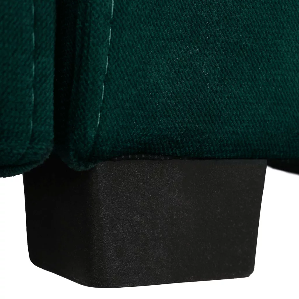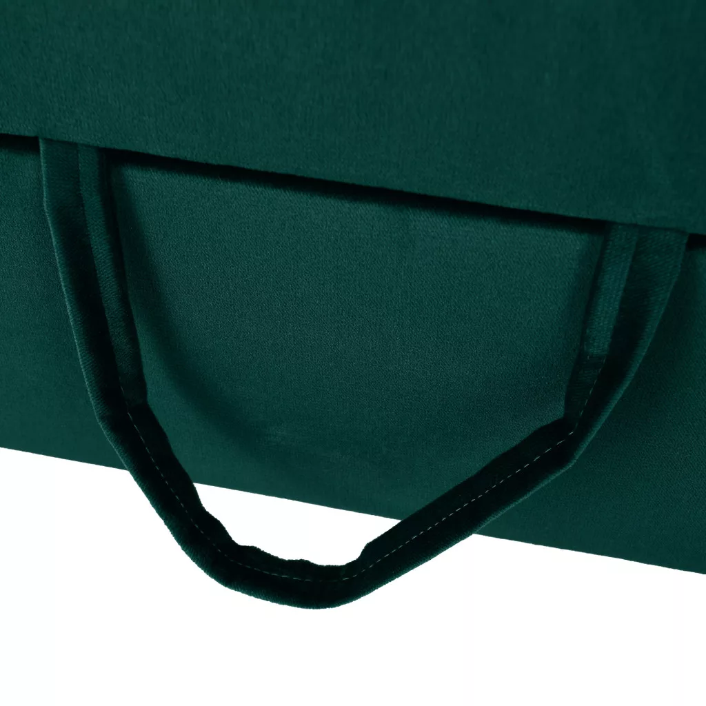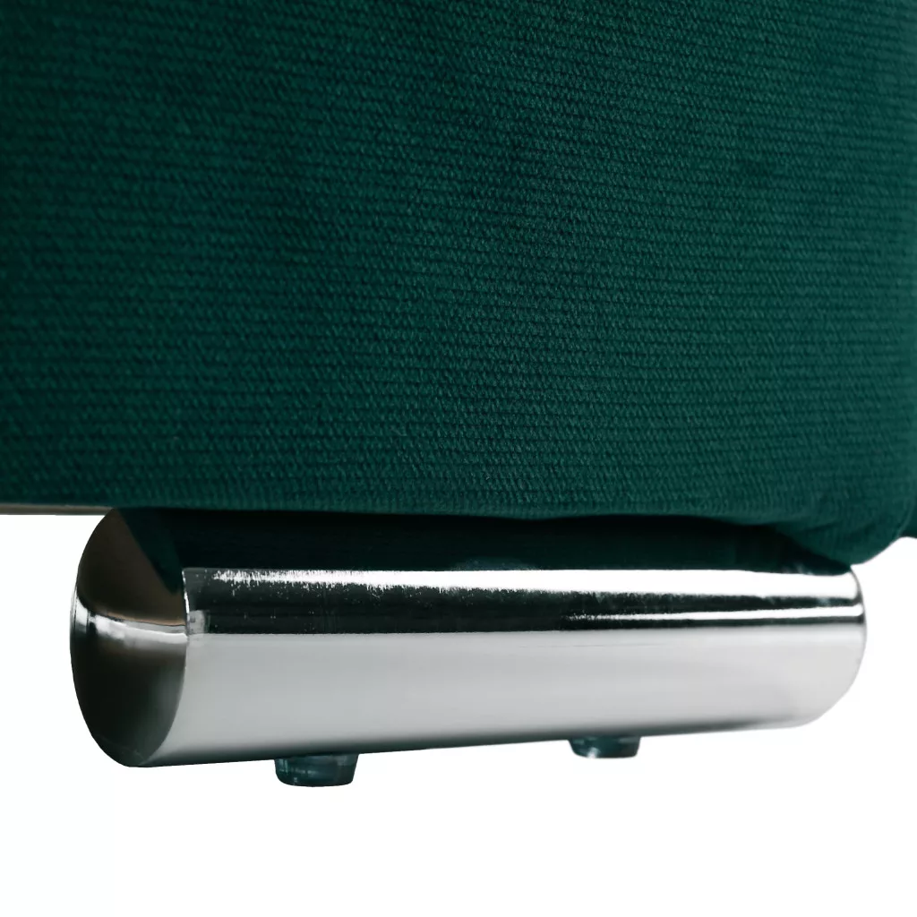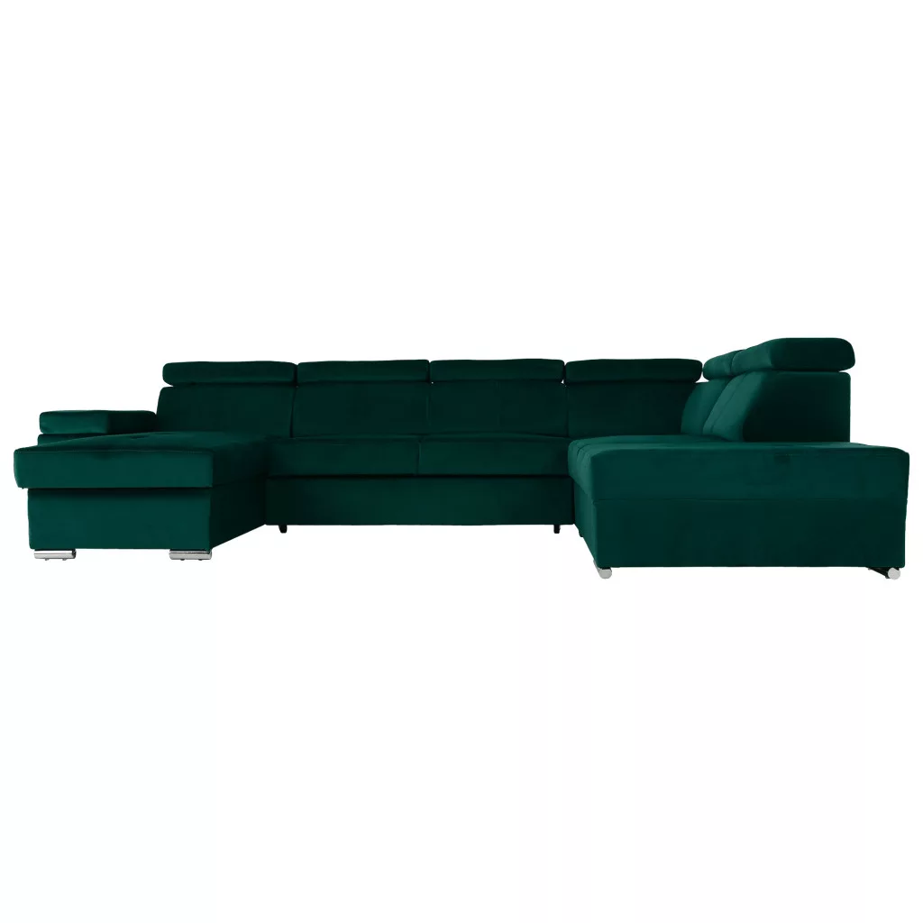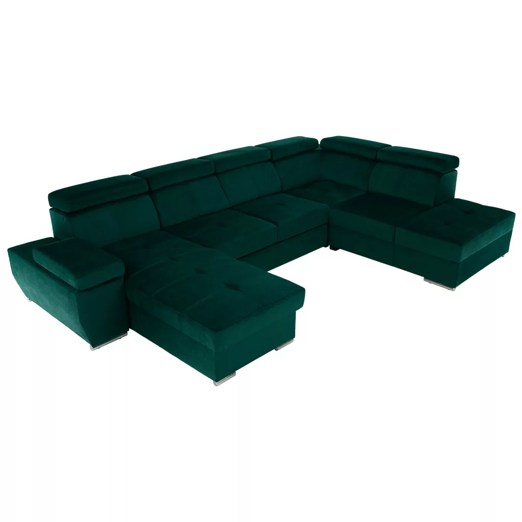 Smaragd színű, szövetből készült U alakú ülőgarnitúra ágyfunkcióval és ágyneműtartóval, jobbos kivitelben.